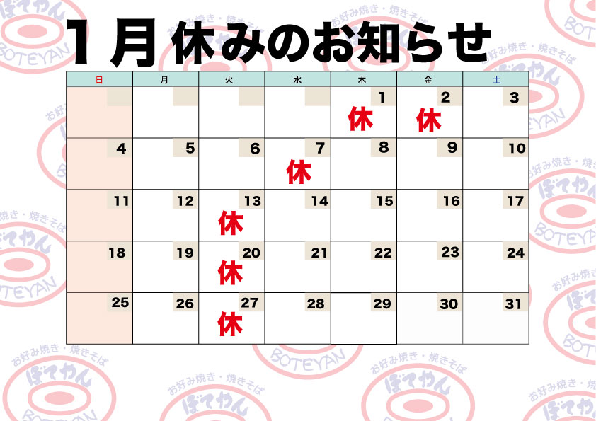 ぼてやん多奈加1月休業日のお知らせ